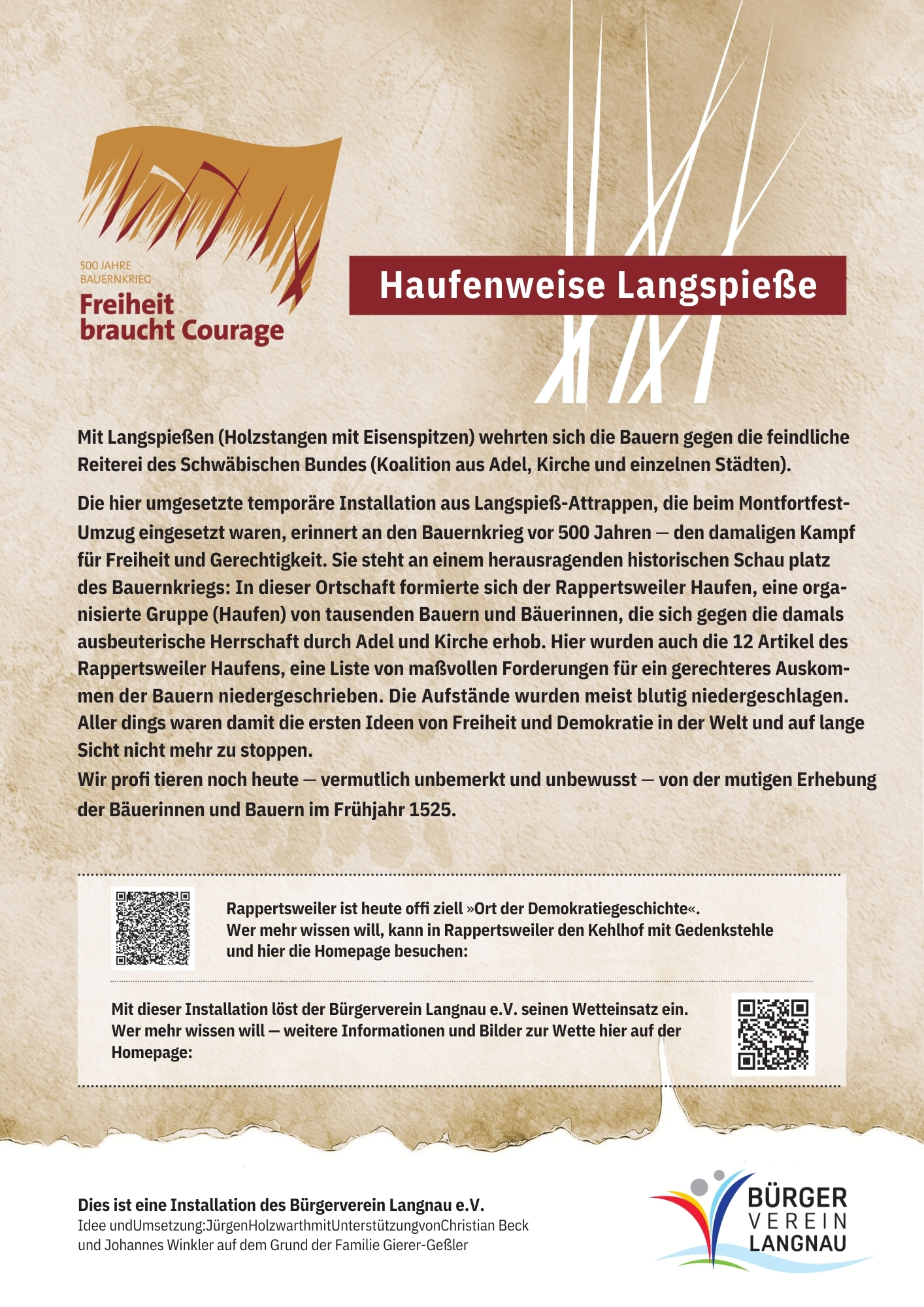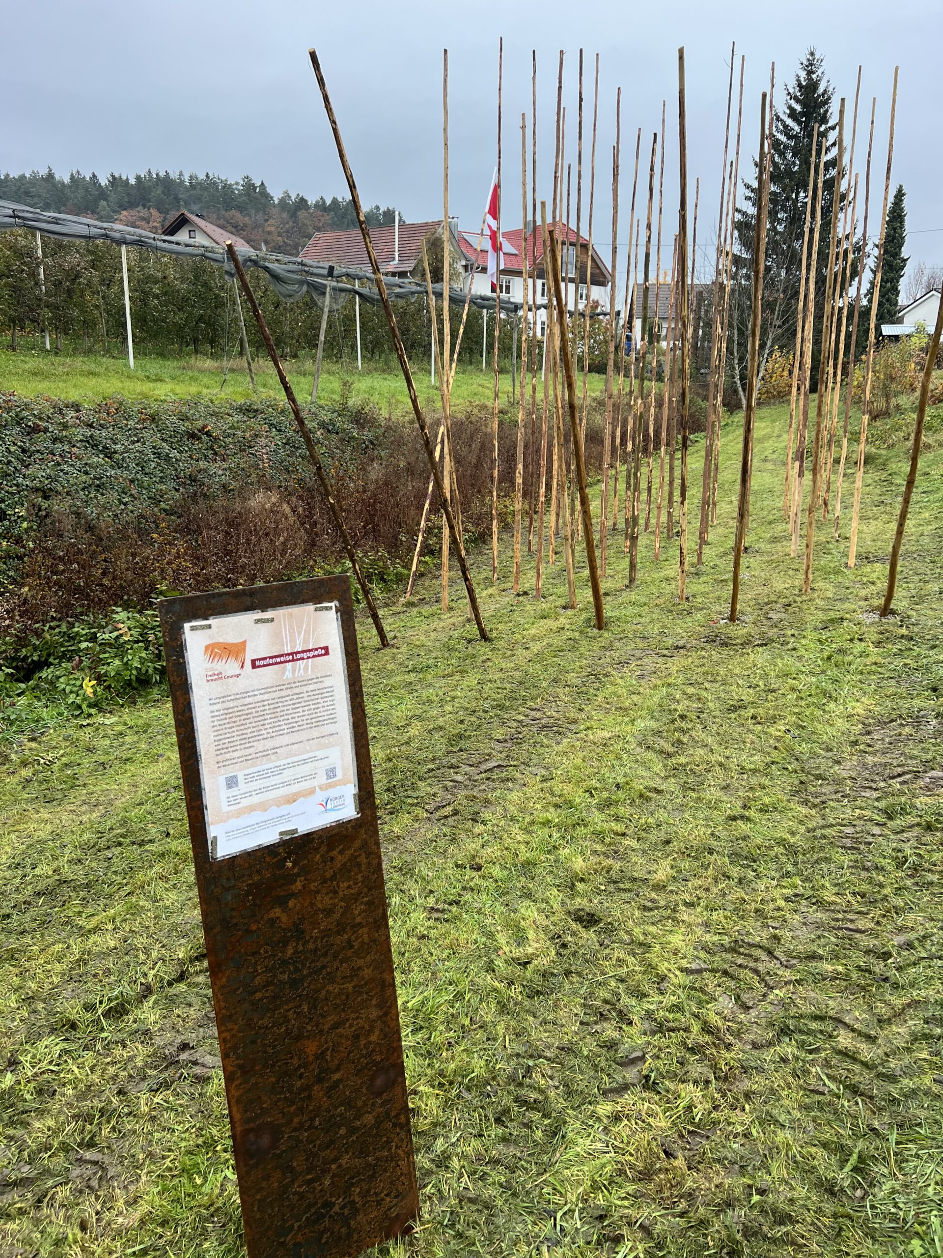 Mit einer temporären Installation aus Langspieß-Attrappen, die beim Montfortfest-Umzug eingesetzt waren und die an den Bauernkrieg vor 500 Jahre erinnern, löst der Bürgerverein Langnau e.V. nun seinen Wetteinsatz ein.